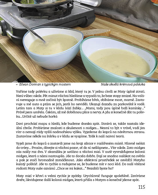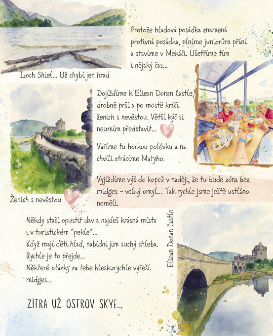 Kapitola vždy začíná akvarelovou deníkovou dvoustránkou. Těšit se můžete i na kapitoly o vestavbě, nepohodlí, počasí ve Skotsku a také na jednu speciálně věnovanou midges (zasloužily si ji).